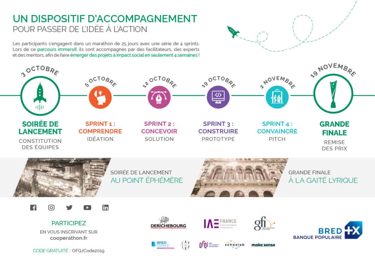 L’Office franco-québécois pour la jeunesse s’associe à nouveau au Coopérathon France organisé par The Factory de la BRED. Ce marathon de 25 jours est composé de 4 « sprints » et d’ateliers thématiques pendant lesquels les participants vont monter leur projet entrepreneurial innovant en collaboration avec des experts et des mentors. Les projets seront répartis en quatre thématiques : éducation, environnement, finance, santé & bien-être.